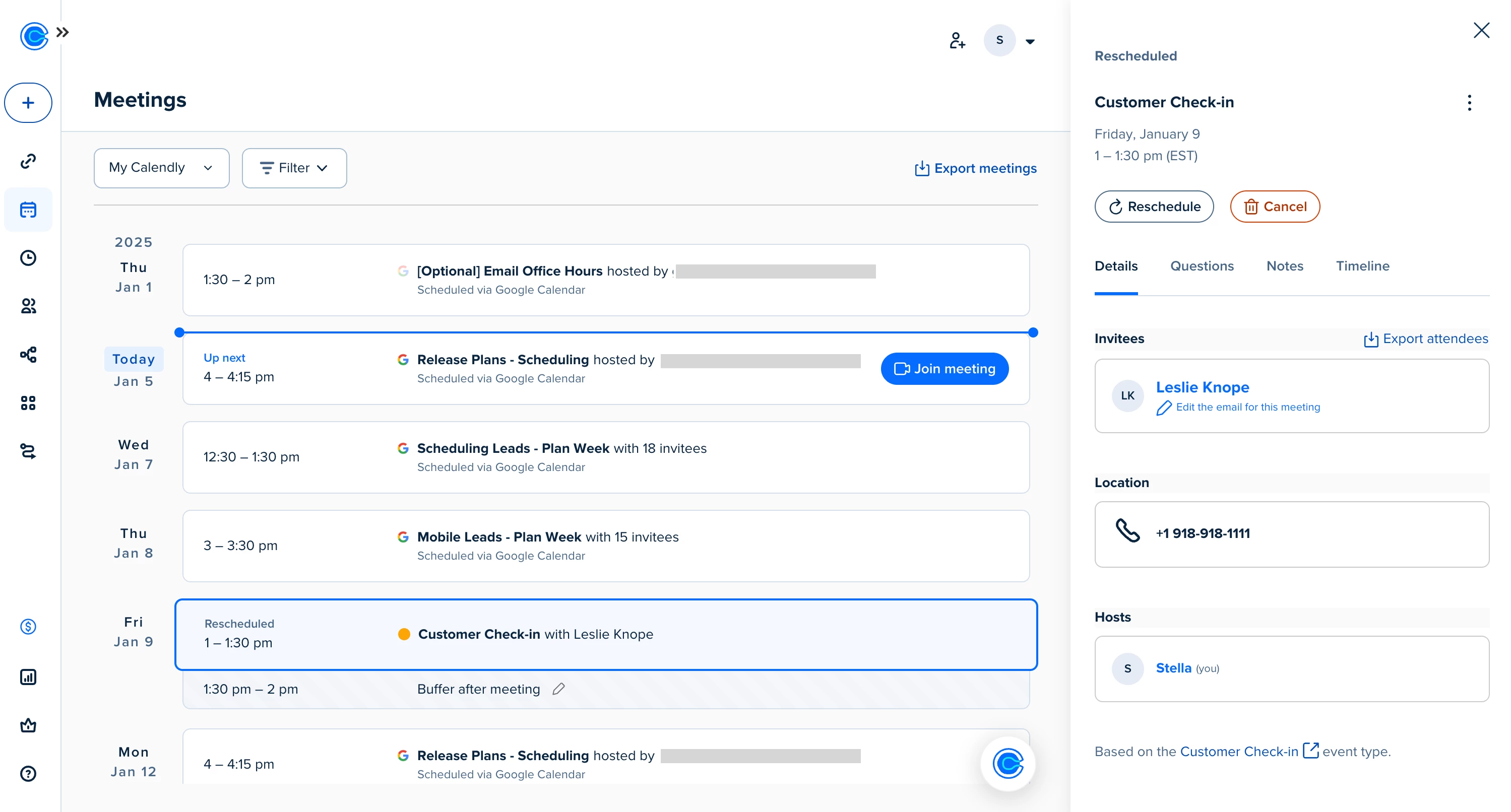 Every time a Calendly meeting is booked, that invitee’s contact profile is automatically created or updated. Click a name in the meeting details panel to quickly schedule a follow-up, send an email, or see their full contact record.
