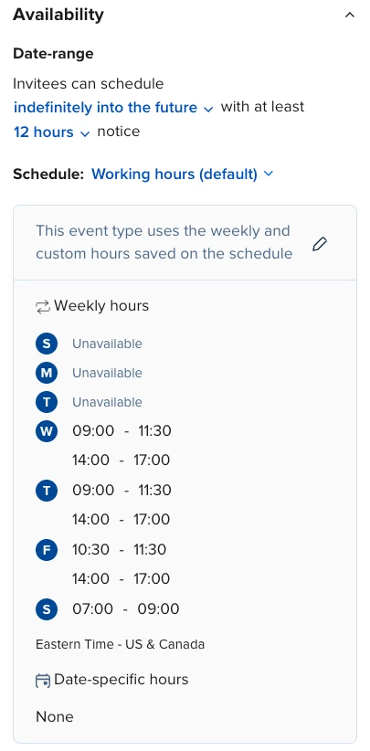 Below, you can see that my availability is correct for this event type. I changed my schedule in “Working hours” and it appears correctly here.