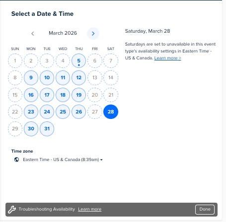 None of the similar threads are addressing my issue. I have availability set, the live calendar is showing I don’t. The calendar is showing I have ZERO availability. It’s not showing some correctly and others not, it’s literally just showing that I have none. No error message. The troubleshooting tool doesn’t work for me because I can’t select a date. I have no buffers set.
