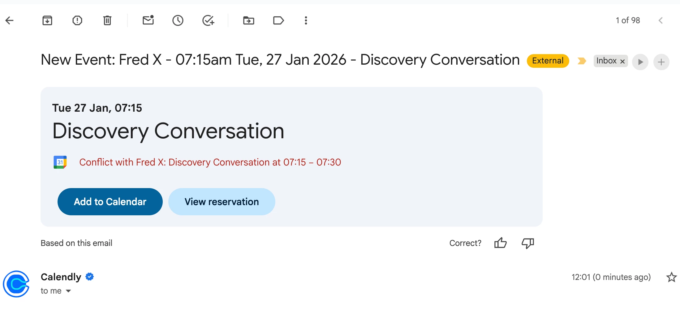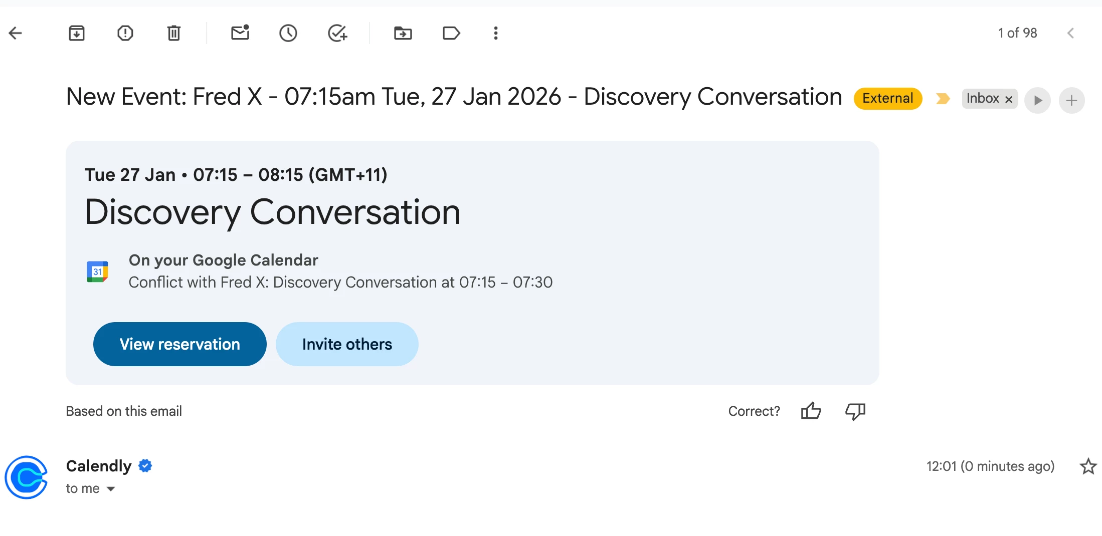 Hi! For months I’ve been getting a “conflict:” on my own Google calendar with Calendly bookings - there is no conflict and I just ignore it and carry on.