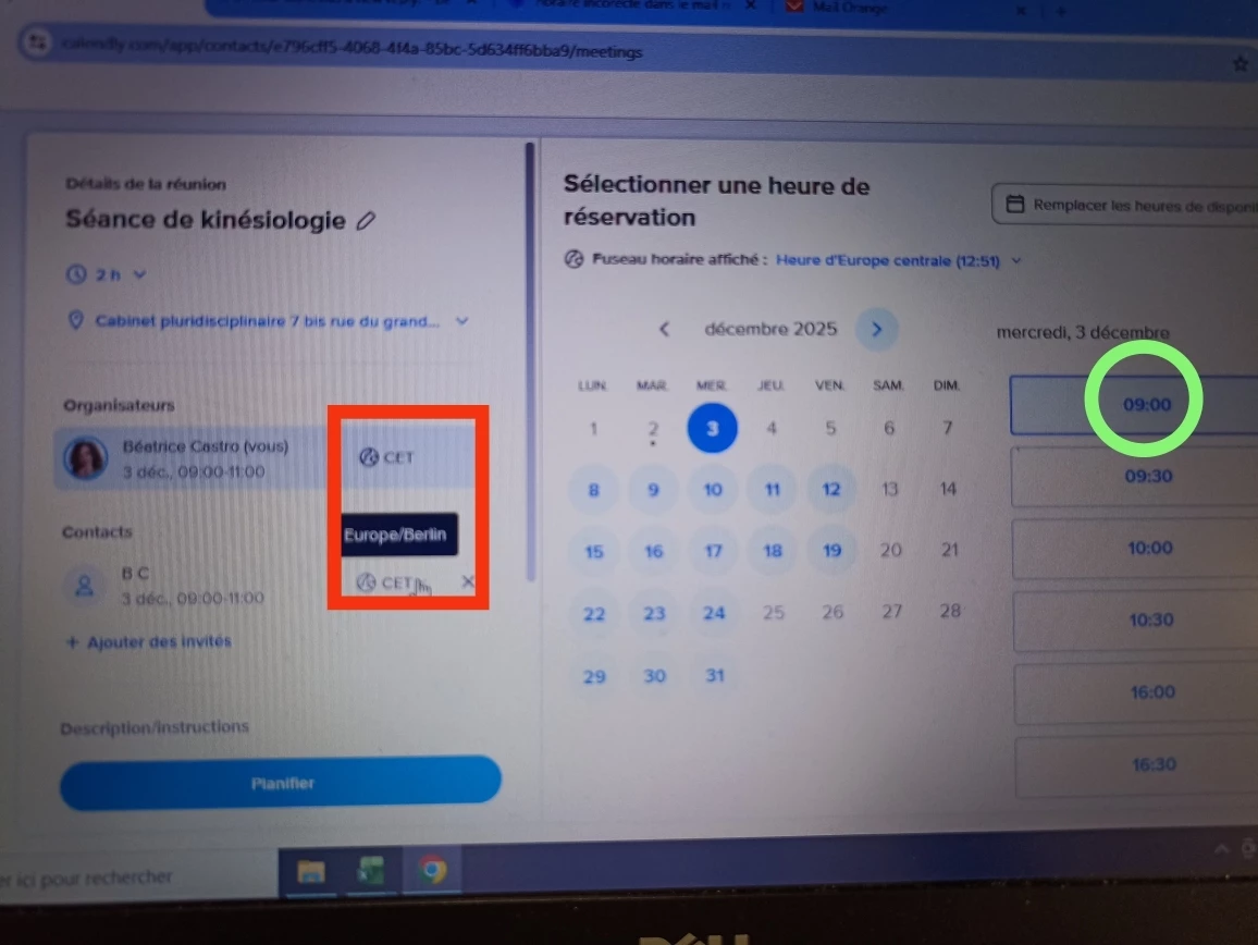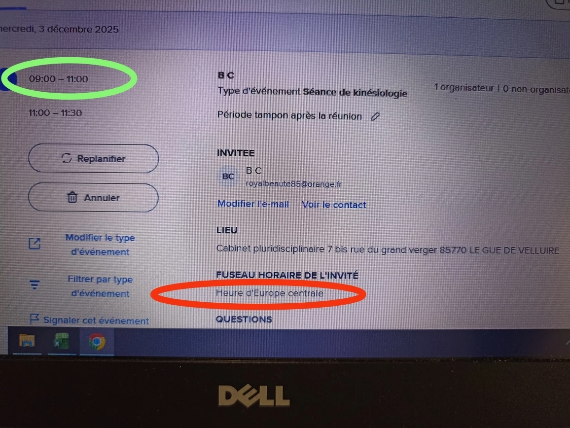 Jai vérifier lors de la prise de rendez-vous en tant qu’invité que le fuseau horaire soit bien pour la France.