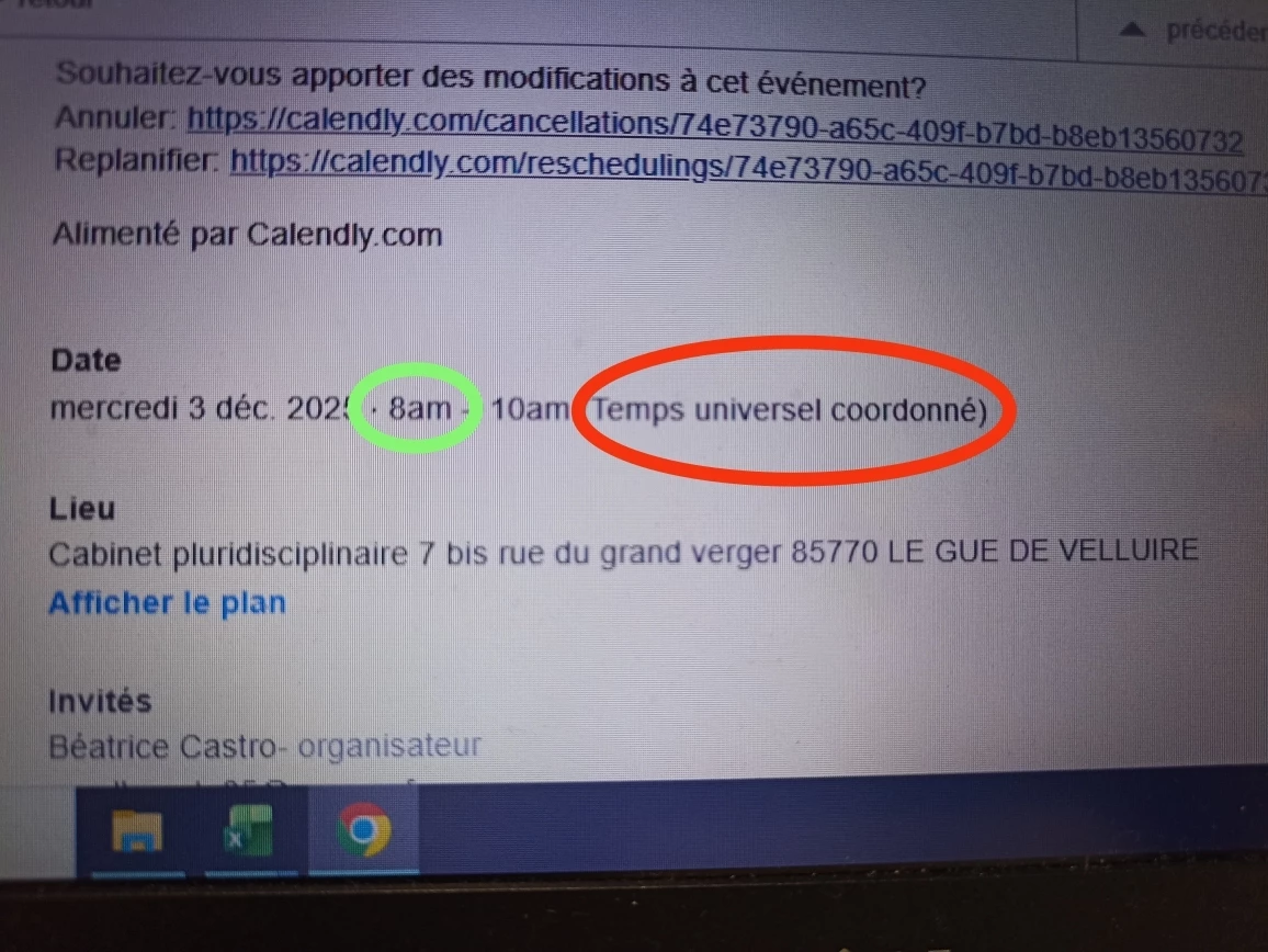 Seuls les invités rencontrent cette anomalie horaire dans leur mail récapitulatif de séance , alors qu’en passant par les liens de report ou annulation l’horaire de prise de rendez-vous, l’horaire est le bon….