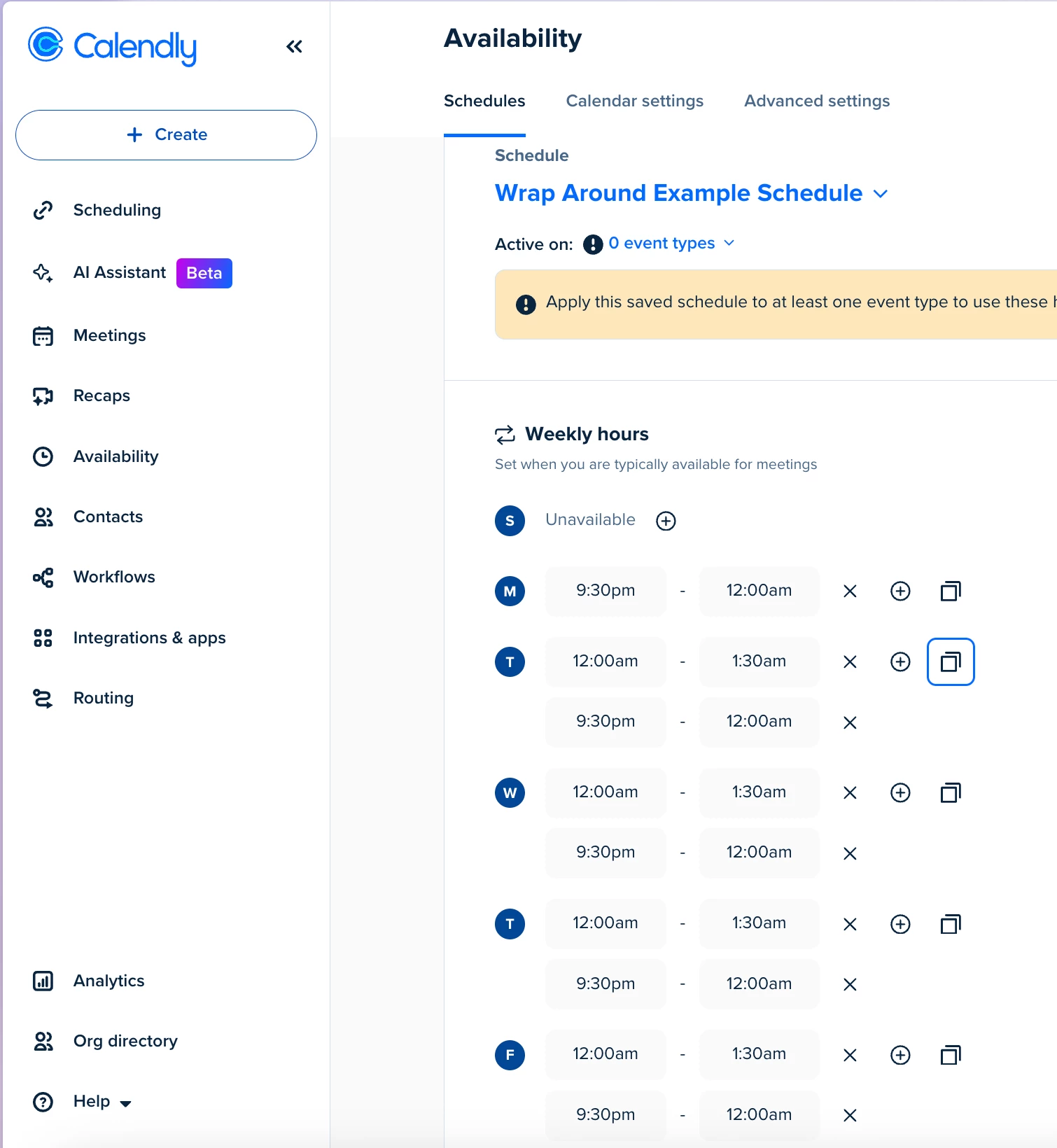 Hi @Ankur, sorry the system isn’t cooperating with you. This is a pretty unique use case and a known limitation with Calendly. We can get you most of the way there, however at this time Calendly does not support events that wrap around from one day to the next. Below I’ve showed you how to set up your schedule to make you available at your suggested times however you will run into problems with scheduling events that run from one day to the next. There are a couple workarounds. One, make shorter events and in the event type description, which the invitee will read, just explain that the event will run past midnight. The other, more risky option, is you could update your timezone so that midnight is at a different time somewhere else in the world. When your invitee goes to schedule with you they will see your Availability in their timezone. But you, as the host, will see it in another. This should allow you to create events that wrap around from one day to the next in your local timezone but all exist on the same day in another timezone. You’ve tricked Calendly into respecting a different 24hour period. Because Calendly auto-detects timezones, based on your connected calendar, there are some potential hiccups you may have to work out.