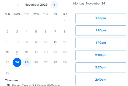 I’m traveling and wanted to set up 20min back to back meeting for an afternoon. Calendly is only showing time segments in 30min increments… 12:30, 1:00, 1:30, etc.. I tried removing any buffers.. For this meeting how do I get the sign up times to 1:00, 1:20, 1:40, 2:00, etc.. -Thank you