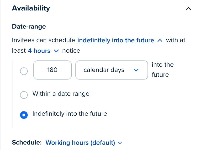 The Indefinitely into the future setting you referenced before controls how far into the future an invitee can book with you. :)