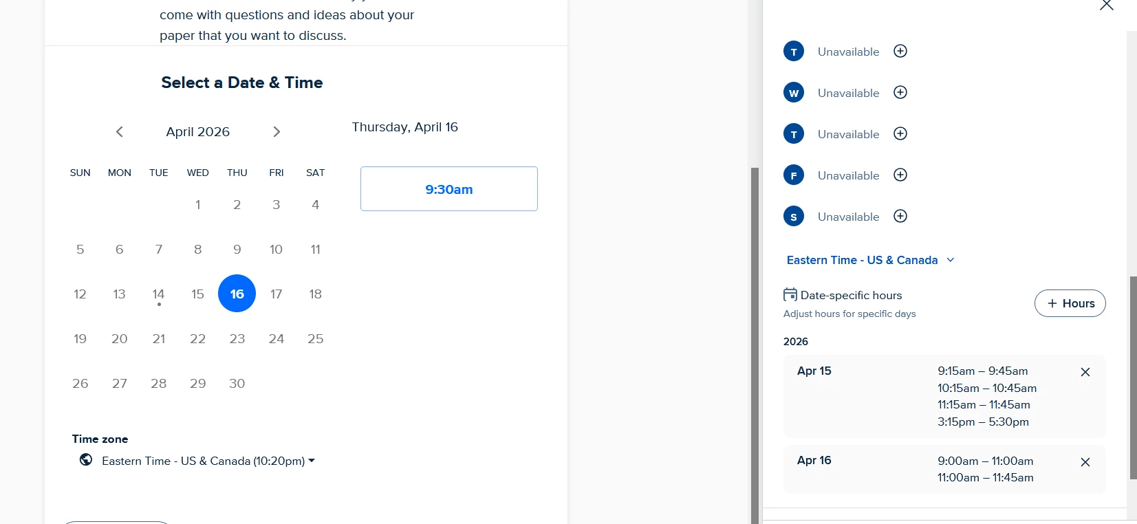I’ve been using Calendly for a long time and have always found it easy to revise the available times to schedule meetings. However, tonight something is definitely wrong. I added an additional time period to my date-specific times and hit save, as I always do. When I look at the preview, though, it’s not showing for my meeting attendees to select. You can see from the screenshot below that I added an 11:00-11:45 window to April 16th, but when you look at the preview, those additional times are not shown (and no one has signed up for them already). I’ve attempted to log out and log back in, but that hasn’t worked. I have also tried multiple browsers and devices. It doesn’t seem to make any difference. The only filter I have set up is a cap of 30 meetings per day, and I’m not even close with the signups I have already.
